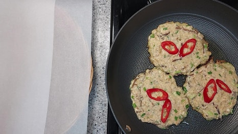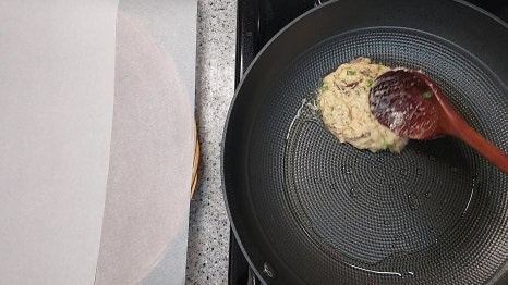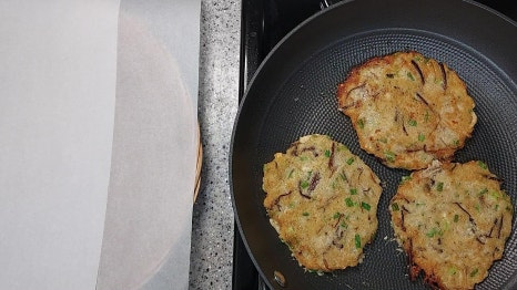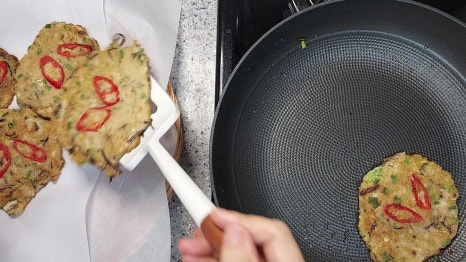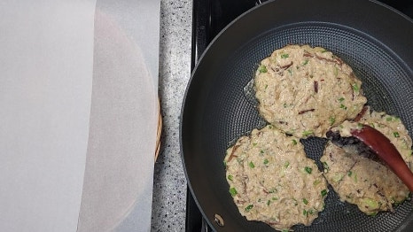 달궈진 팬에 기름을 넉넉히 두른 후 한 국자씩 반죽을 떠서 올려주세요.