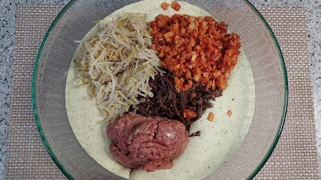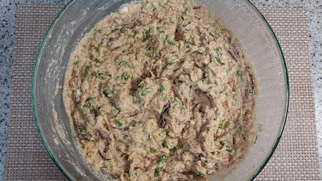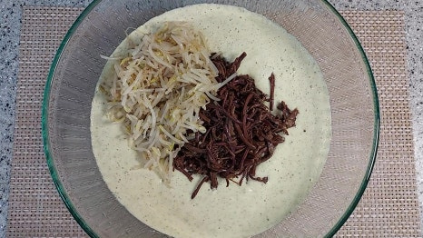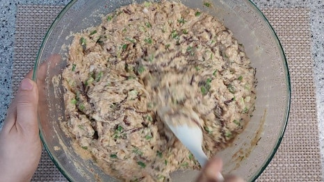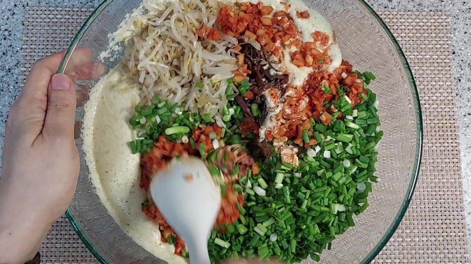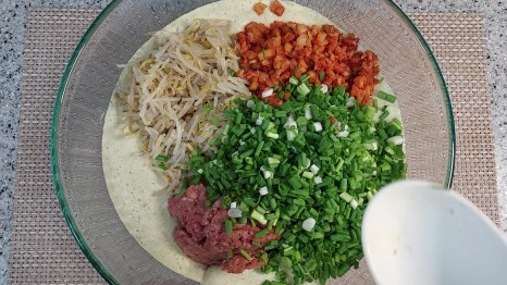 녹두 반죽에 준비한 속 재료를 모두 넣어주세요.