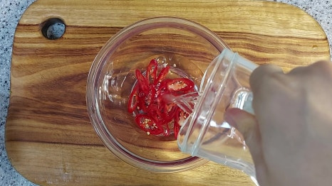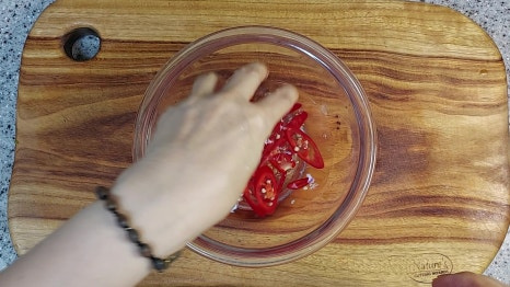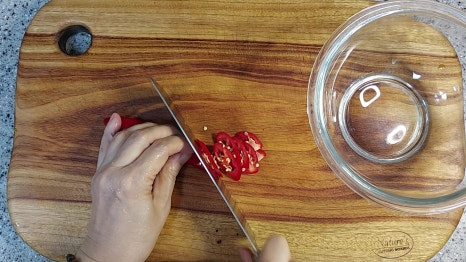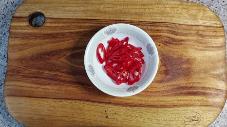 홍고추는 가늘게 어슷 썬 후 물에 씻어 씨를 털어내주세요.
