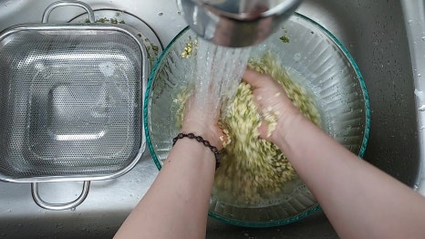 불린 녹두는 남아있는 껍질을 최대한 제거할 수 있게 살살 비벼가면서 씻어주세요.