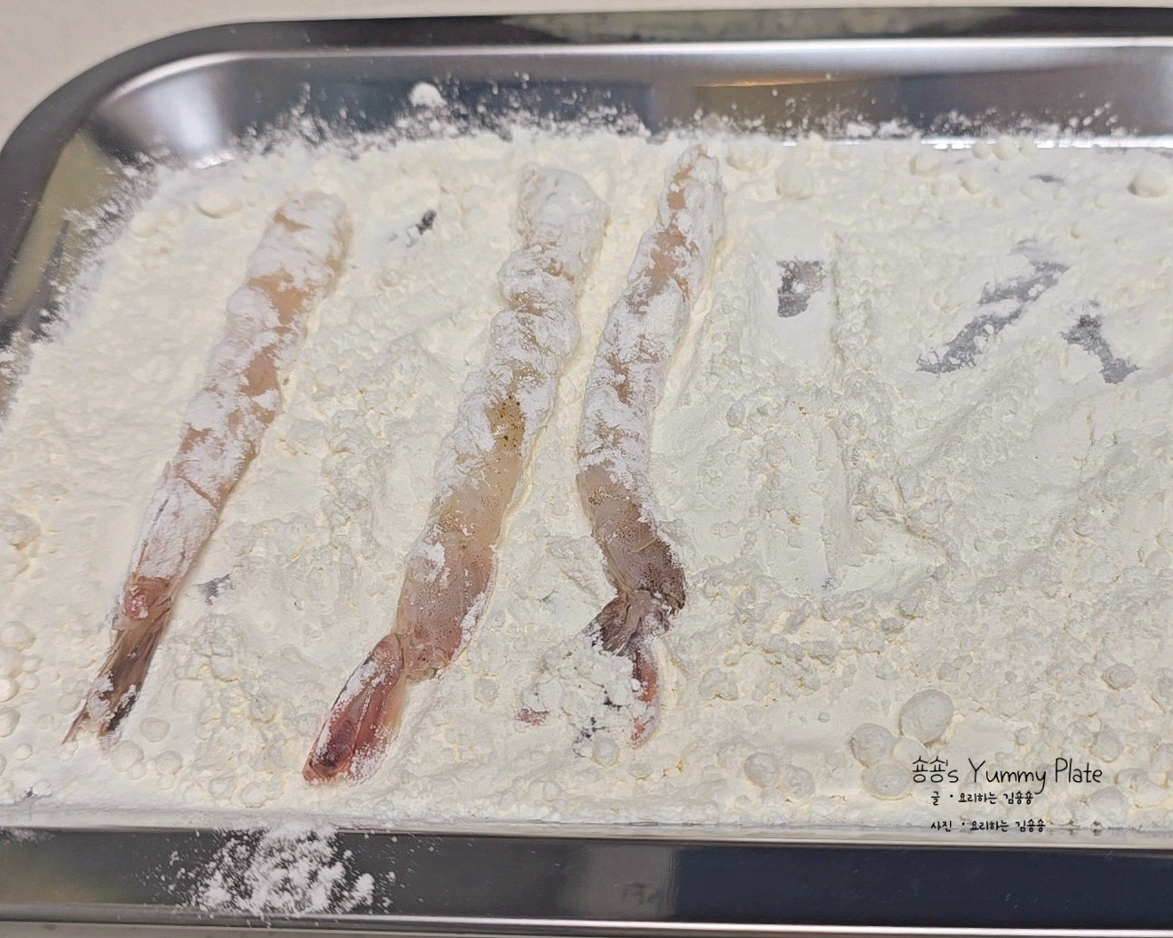 준비해둔 새우는 물기를 한 번 더 제거한 후 덧가루를 골고루 묻혀주세요.
