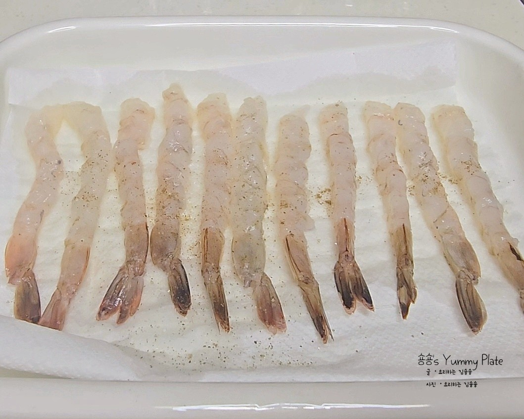 손질한 새우는 키친타올 위에 올려 수분을 제거한 뒤 소금과 후추를 살짝 뿌려 밑간을 하고 10분간 양념이 배도록 재워두세요!