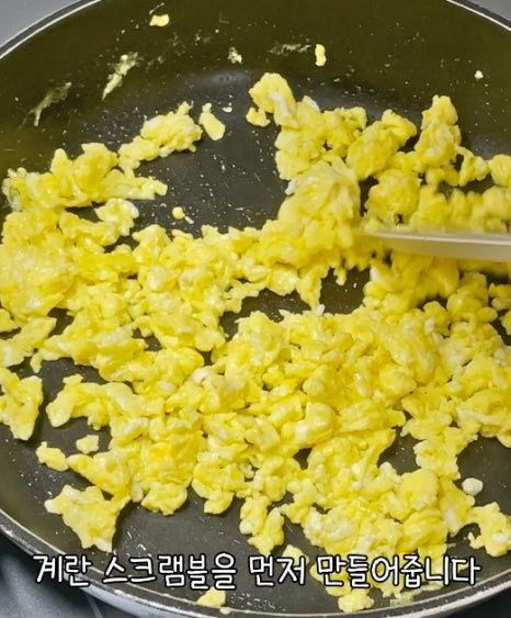 팬에 기름 두르고 계란 풀어서 휙휙 저어가며 스크램블이 완성되면 바로 따로 접시에 담아 열을 식혀줍니다!