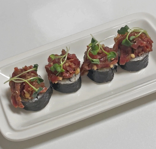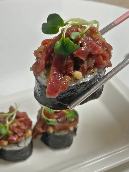 이 방식의 요리는 김밥의 슴슴한 맛과 육회와 김밥 사이에 와사비를 넣어 코끝이 찡한 맛과 육회의 고소한 맛이 결합된 요리입니다!