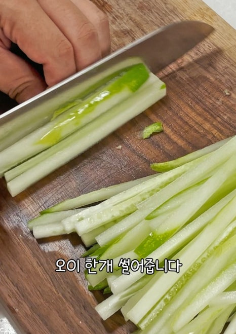 김밥 속 재료는 너무 두껍게 썰면 말기가 어려우니 오이는 얇고 길게 채 썰어서 준비 해 줍니다!