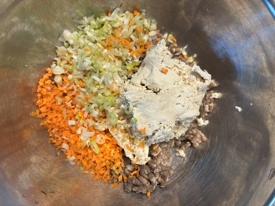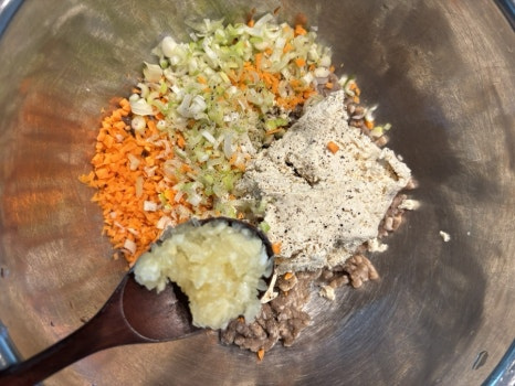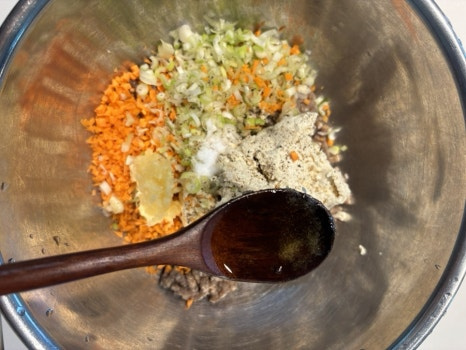 물기 제거한 두부, 소고기와 다진 야채를 몽땅 넣었으면 맛있는 밑간을 해 줄게요.
