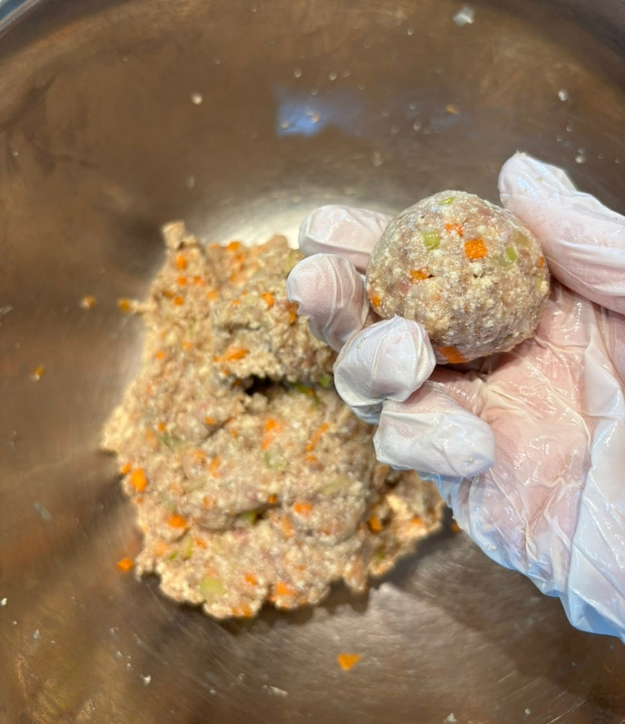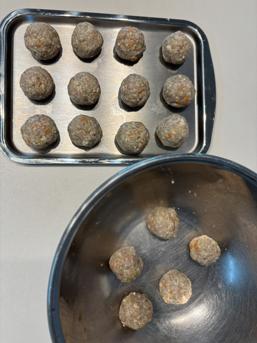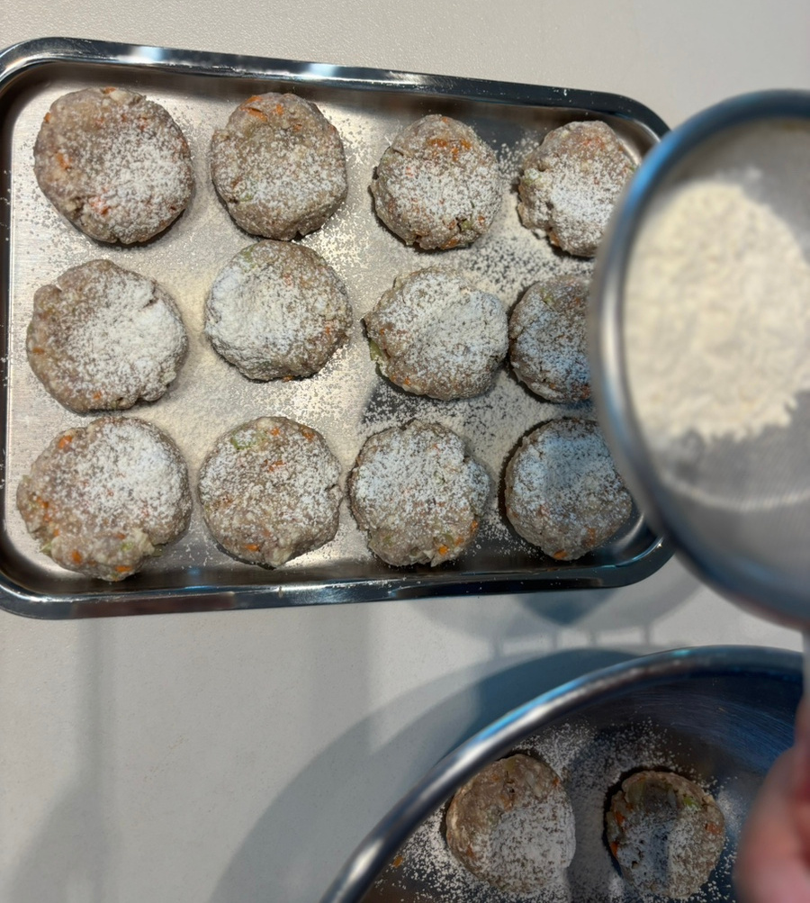반죽을 일정한 양으로 떼어서 사진처럼 동글동글 굴려주세요. 매끈하게 동글동글 모양을 잡아주면 동그랑땡 반죽 완성! 저는 18개 정도 분량이 나왔어요