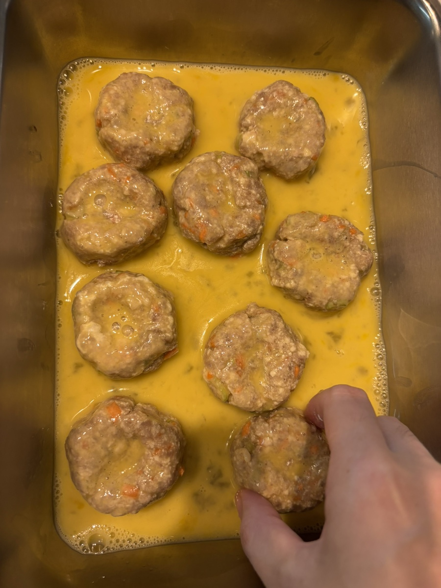 다른 밧드에는 계란 2개를 톡 깨서 곱게 풀어주세요 밀가루옷 입힌 동그랑땡을 계란물에 퐁당 담가 주고요, 앞뒤로 달걀물을 입혀주세요. 얇게 입혀내기 위해 부치기 직전에 살짝 세워서 계란물을 또르르 흘러내리도록 해 주시면 좋아요
