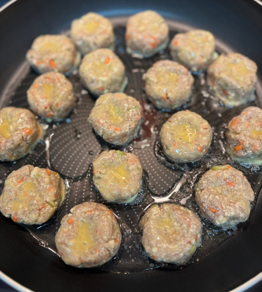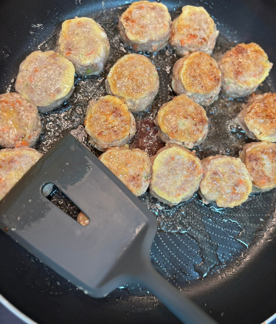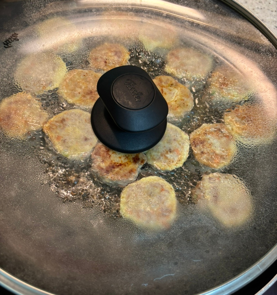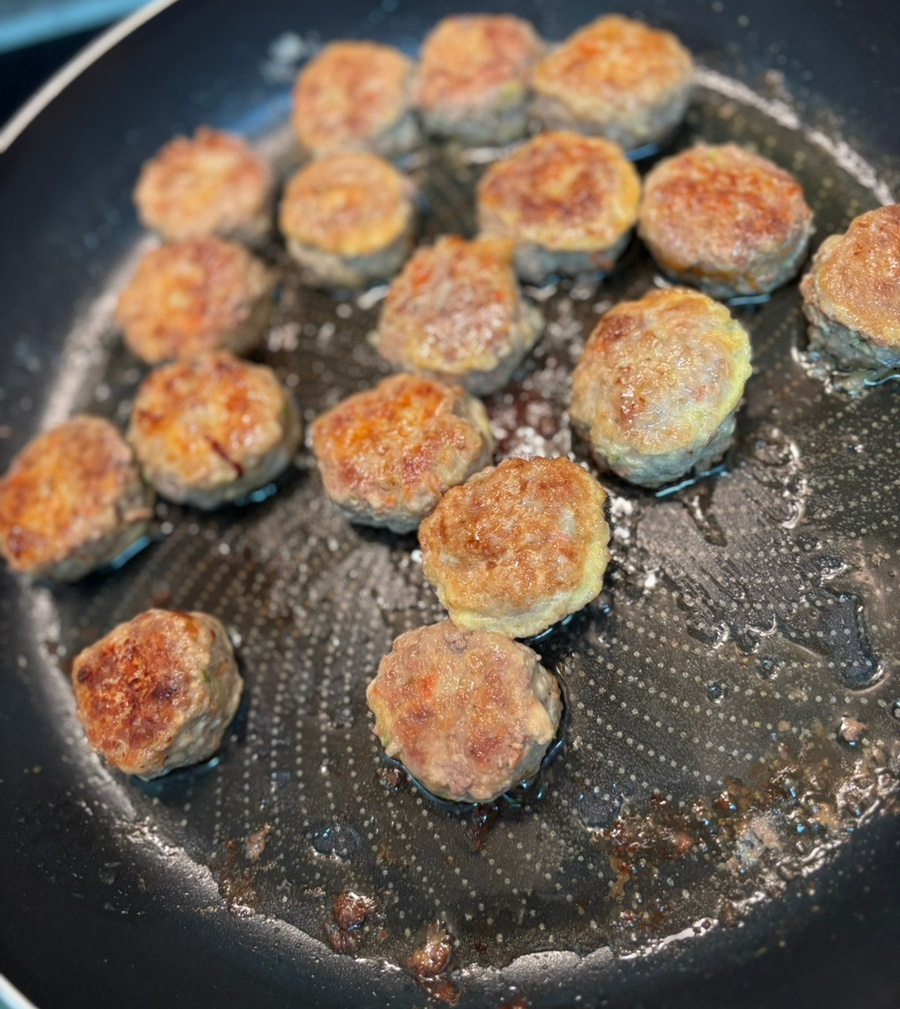 뚜껑을 이용하지 않을 때는 중불~중약불을 유지해가면서 동그랑땡을 세워 사이드 부분도 굴려 익혀주시면 좋아요