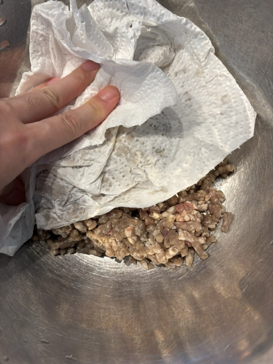 키친타올로 꾹꾹 눌러가며 핏기를 제거해 주세요. 다진 고기의 누린내를 잡기 위해 핏기와 수분 제거는 필수예요 ><