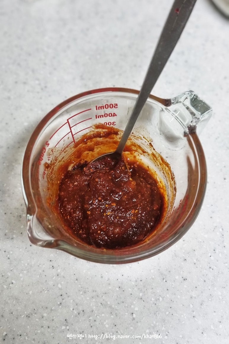 양념 : 고추장2, 고춧가루1, 다진마늘2, 다진생강1(또는 생강가루), 올리고당1, 청주2, 간장2, 카레가루1