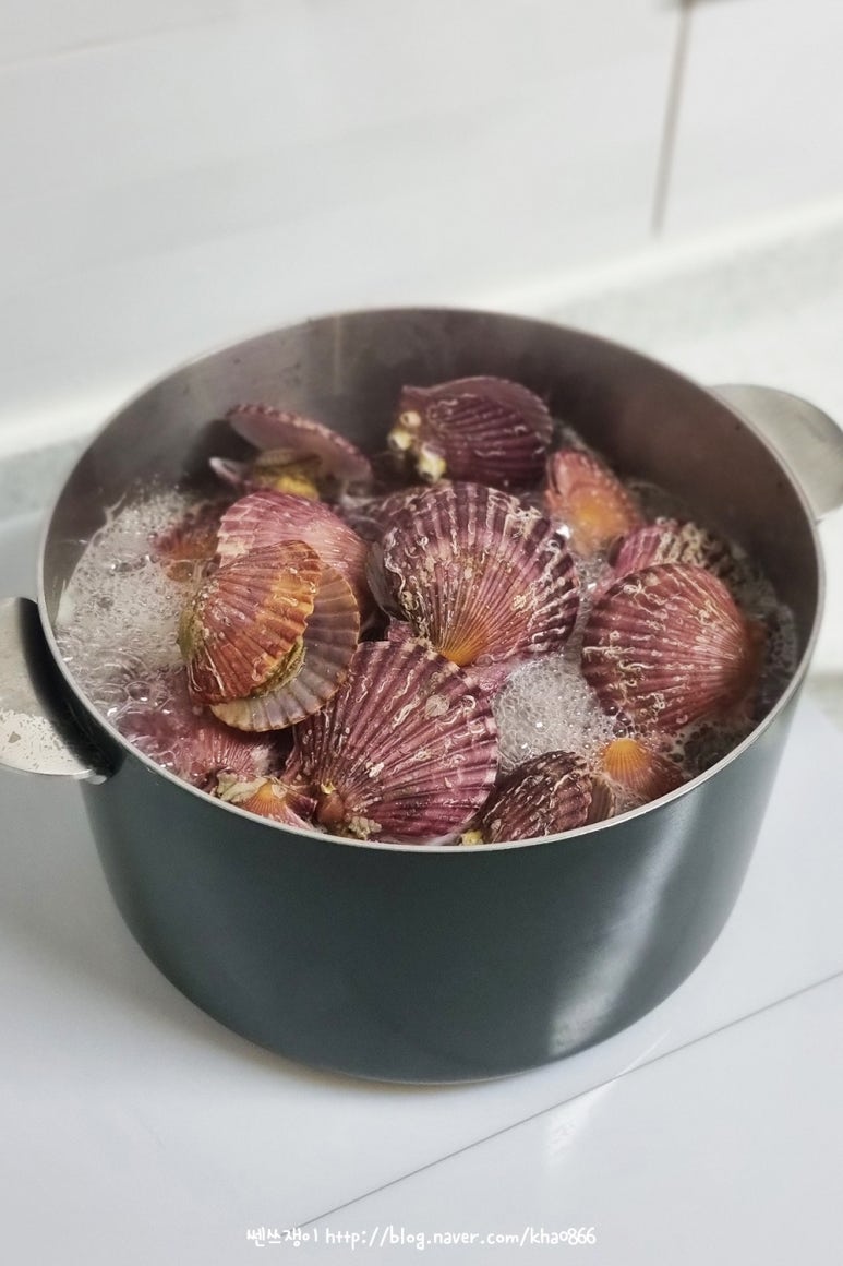물 한방울 넣지않고 빈 냄비에 가리비만 넣고 끓였는데 저렇게 수분이 생겨서 쪄져요~