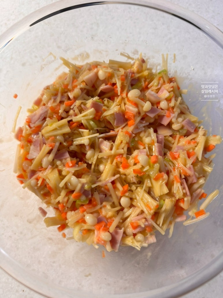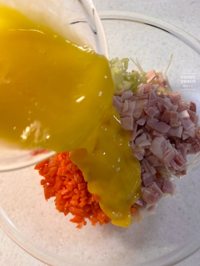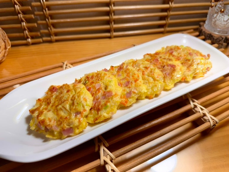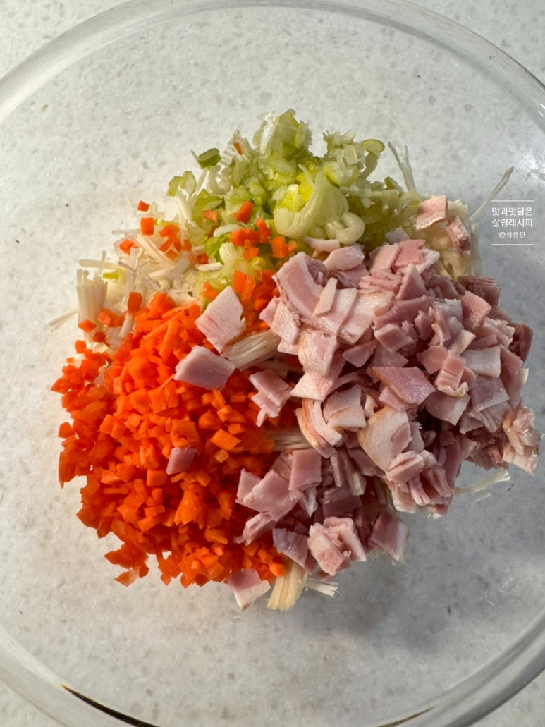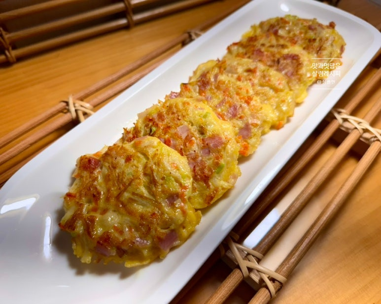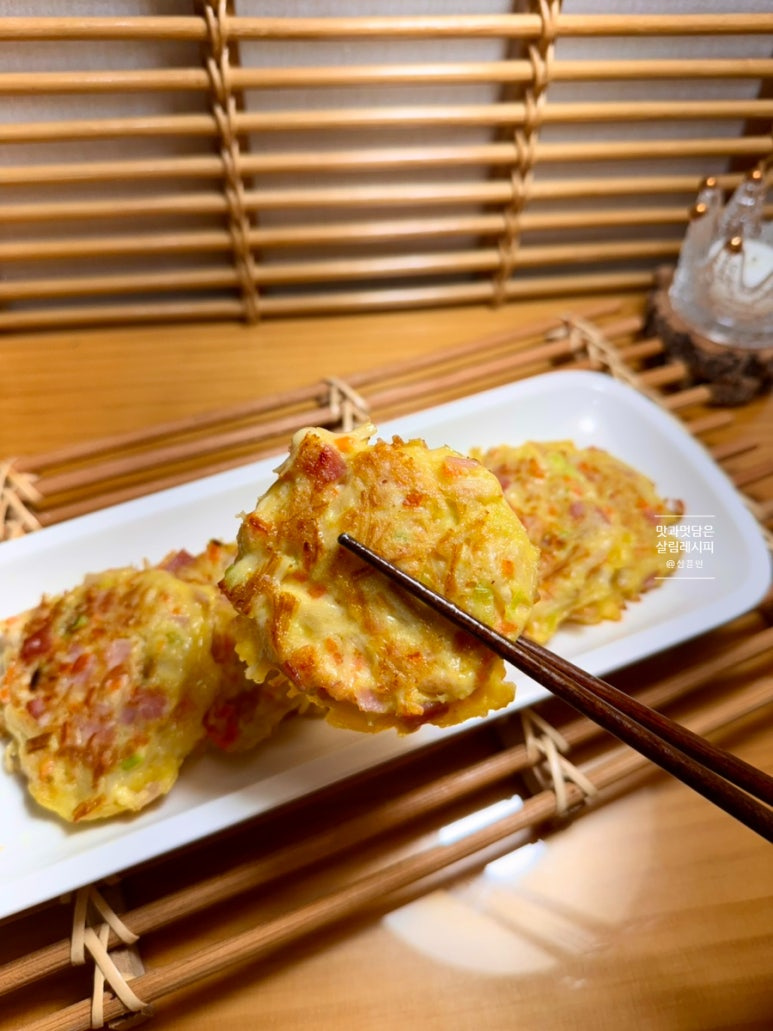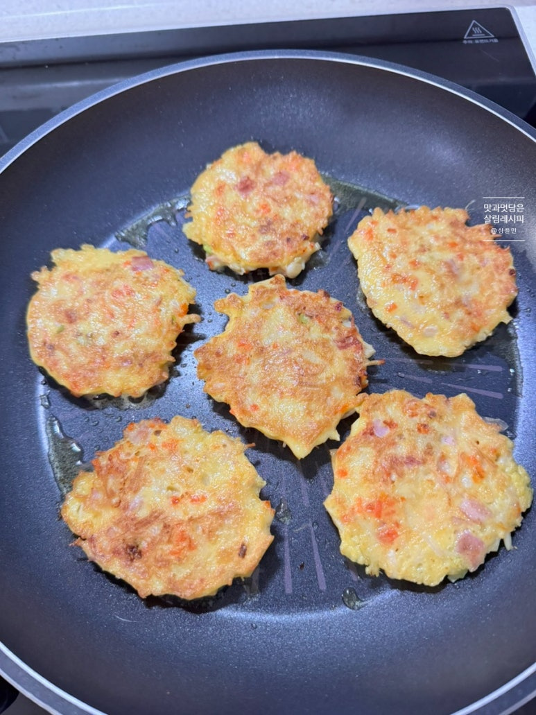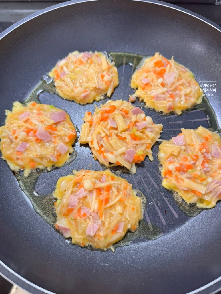 당근과 파 잘게 썰고 햄이나 베이컨도 함께 설어 추가해 주면 감칠맛 최고인데요. 여기에 달걀 풀어 넣으면 따로 수분을 추가하지 않아도 재료 자체의 수분으로 맛있게 반죽해 부쳐낼 수 있어요.