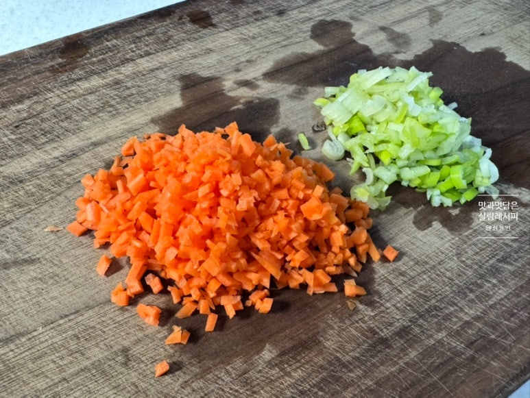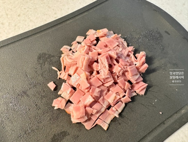 나머지 재료인 당근과 대파도 잘게 썰어 주세요. 베이컨도 작게 썰어줍니다. 앞서 말한 바와 같이 베이컨 대신 캔참치나 크래미를 활용해도 좋아요.