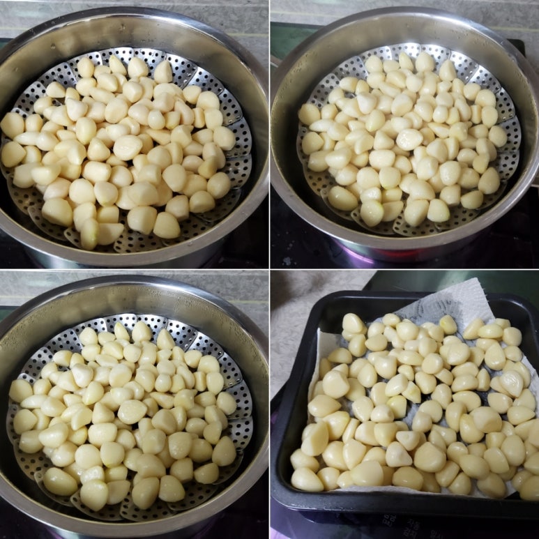 찜기를 이용해서 마늘의 아린맛을 잡기 위해서 10분간 삶아주세요.