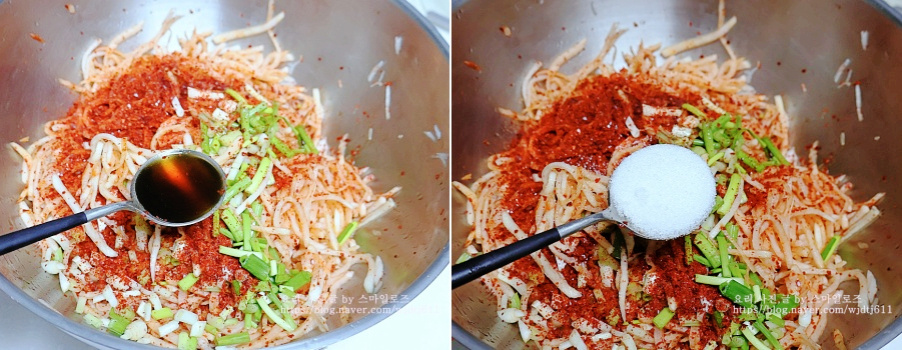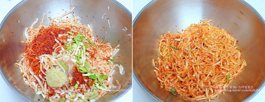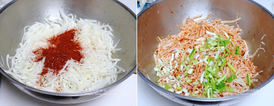 볼에 물기 뺀 무를 넣고 고춧가루 4스푼을 넣고 골고루 비벼 무쳐 놓으면