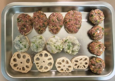 주재료 : 연근, 다진 소고기, 칵테일새우(냉동), 쪽파, 양파, 애호박, 당근, 계란,, 밀가루, 전분가루