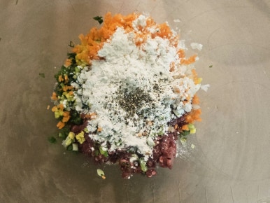 준비해둔 모든 재료를 볼에 넣어주고 밀가루 1숟가락, 소금 두꼬집, 후추 살짝 넣고 찰기가 생기게끔 잘 버무려주고 잠시 모셔둔다