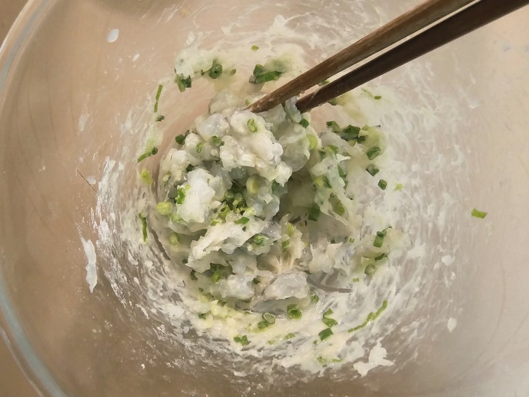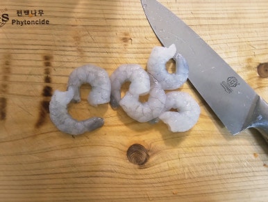 난 냉동칵테일새우를 사용했는데... 해동된 새우 6마리를 칼 옆면을 사용해서 으깨어준 후 칼로 다져서 믹싱볼에 담아준다