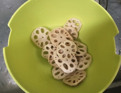 손질된 연근이니깐 그냥 깨끗하게 2~3번 씻어서 물기를 제거해주고 잠시 모셔둔다