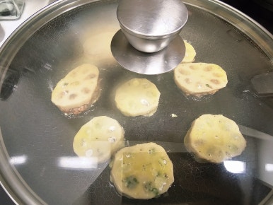 새우반죽도 똑같이 연근 한쪽면에 한숟가락 올려주고 속까지 채워지게끔 눌러주면서 채워준다