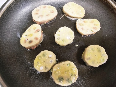 연근 한쪽면에 소고기 반죽을 한숟가락 올려서 연근속까지 반죽이 들어가게끔 눌러주면서 채워준다