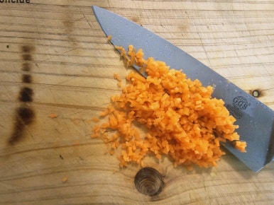 애호박도 어른 손가락 한마디 정도를 잘게 다져서 준비해주고 당근도 어른 손가락 한마디 정도를 잘게 다져서 준비해준다