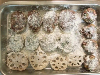 정성스럽게 채워놓은 연근 양면에 밀가루를 뿌려서 묻혀준다