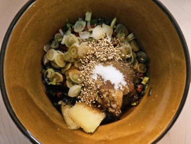 손질해놓은 재료를 모두 넣고 간장 소주잔 2컵, 설탕 1/2숟가락, 참기름 2숟가락, 간마늘 2숟가락, 깨소금 1숟가락을 넣고 잘 섞어서 비빔양념장을 만들어준다