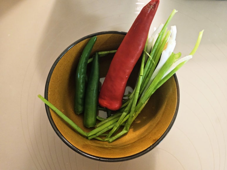 고추 2개(땡초도 상관없음), 홍고추 1개, 쪽파 3~4뿌리, 대파, 간마늘을