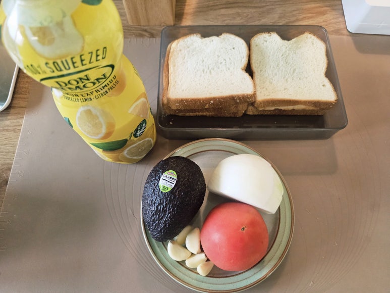 아보카도 1개, 양파 1/2개, 토마토 1개, 통마늘 5알, 레몬즙 그리고 식빵!