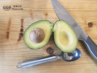 아주 잘 익은 아보카도를 칼로 반으로 자르는 한바퀴 쭈~~욱 돌려서 칼집을 내어주고 양쪽을 잡고 돌려주면 씨와 함께 반으로 아주 잘 분리된다