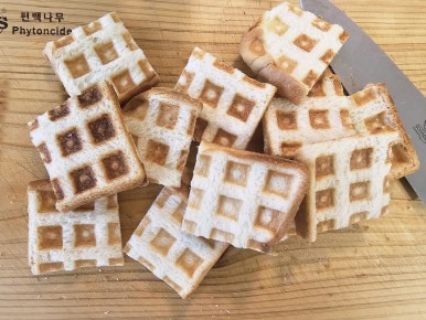 식빵 3장을 그냥 구워도 되지만... 좀 더 바삭한 식감을 주기 위해 와플기에 버터를 바르고 와플처럼 노릇노릇하게 구워서 준비해준다