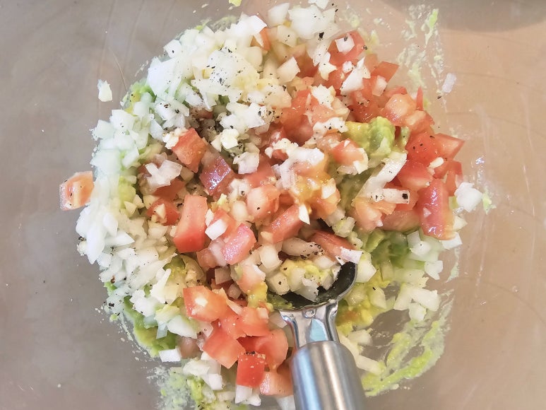 손질한 모든 재료를 으깨어놓은 아보카도에 모두 넣은 후 소금 1/3숟가락, 후추 1/3숟가락, 레몬즙 1~2숟가락을 넣고 골고루 잘 섞어주면 과카몰리 완성!