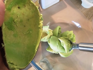 숟가락으로 아보카도의 속을 파낸 후 숟가락으로 부드럽게 골고루 으깨어주고 잠시 모셔둔다