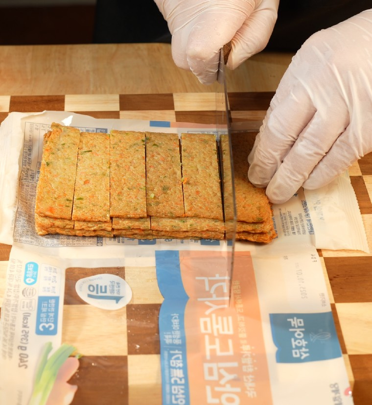 사각 어묵을 먹기 좋은 6등분으로 썰어 준비합니다.