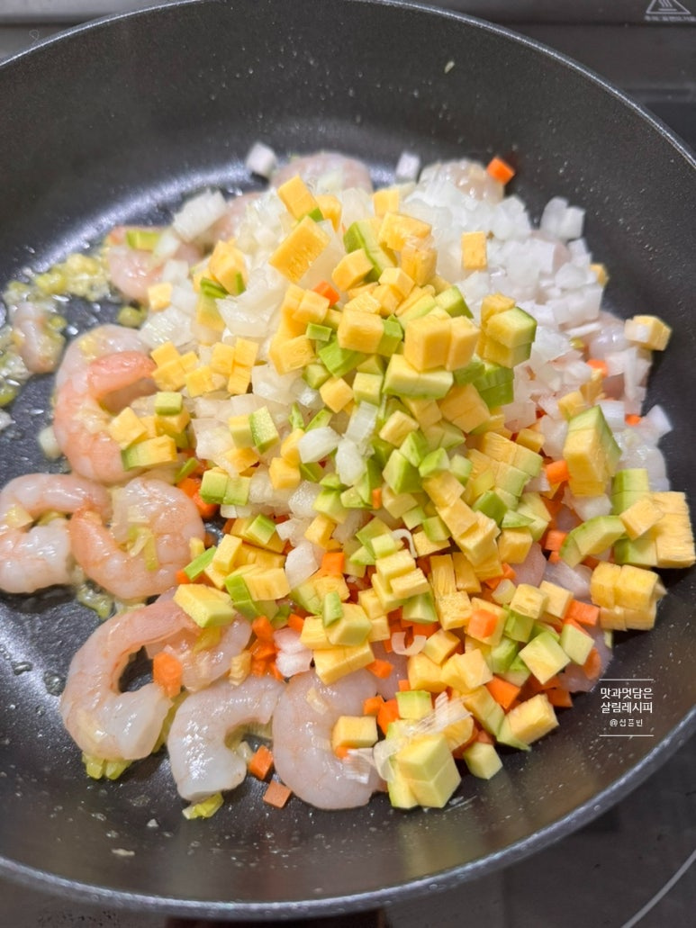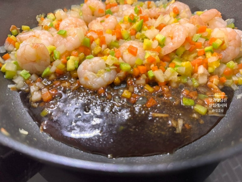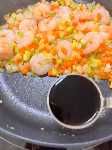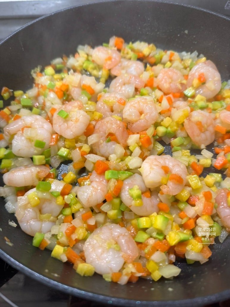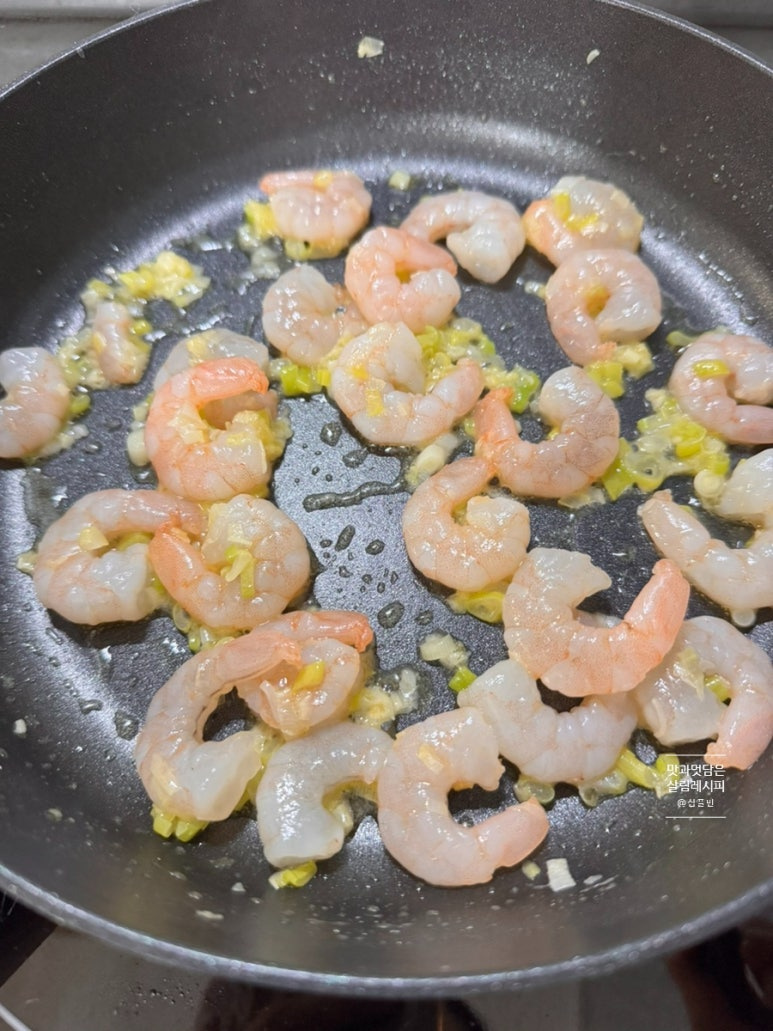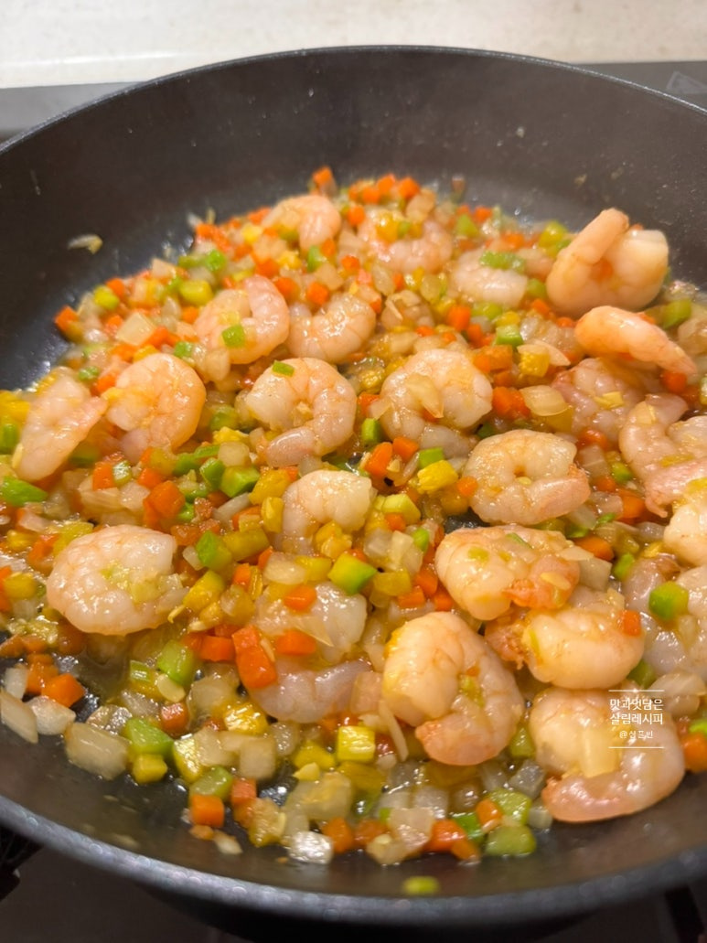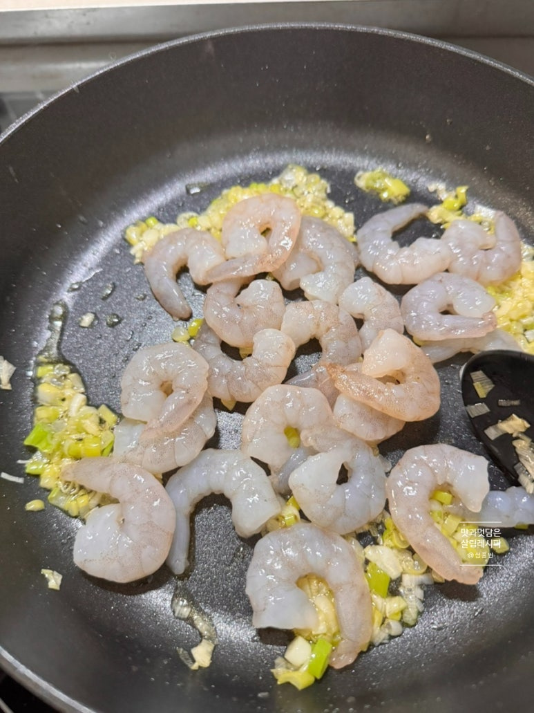 다음 새우를 넣어 줍니다.2~3분간 가볍게 볶아 익혀주는데요. 새우의 크기에 따라 시간을 조절해 주며 볶아요.