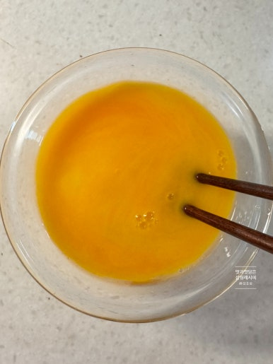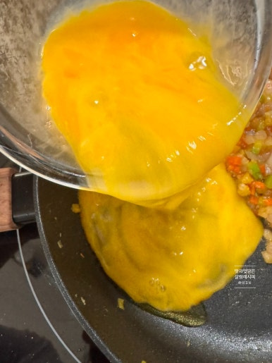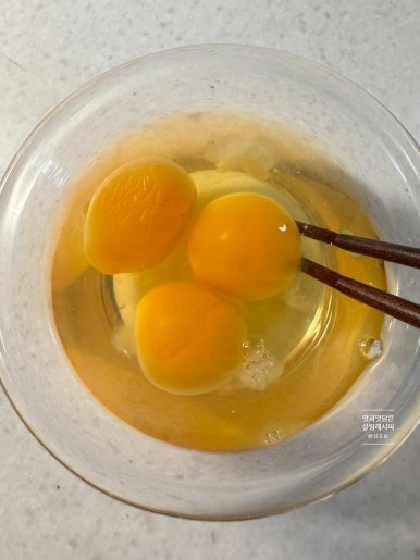 스크램블 해 줄 달걀 3개를 미리 깨뜨려 풀어주었는데요. 바로 팬에 넣고 익혀가며 풀어도 좋습니다.