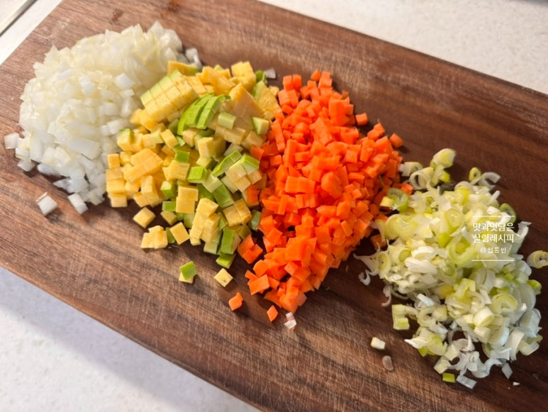 양파, 호박, 당근, 대파 모두 잘게 다지듯 썰어줍니다. 기호에 따라 좀 더 크게 썰어주어도 좋아요.