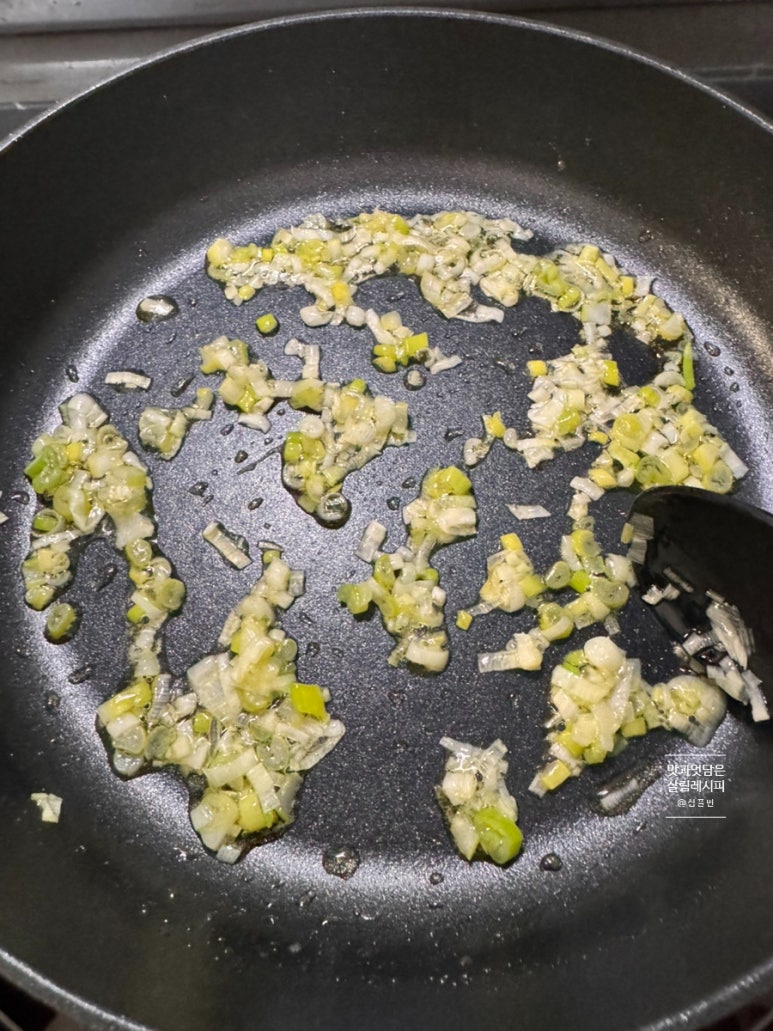 충분히 달군 팬에 식용유 3큰술을 넣고 파 볶아 기름내 줍니다. 노릇해질 정도로 볶아주세요.