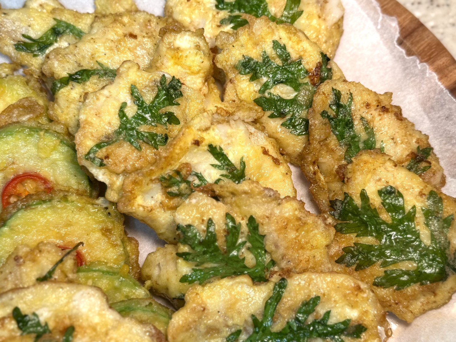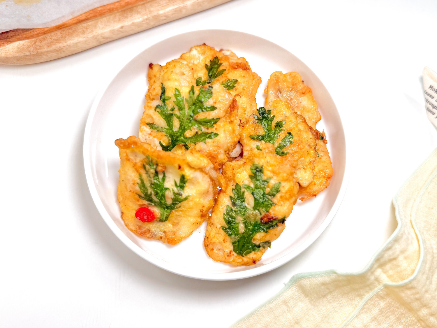 냉동 동태살 300 g , 부침가루 , 달걀 3 알 , 후추 , 소금 , 쑥갓 , 홍고추