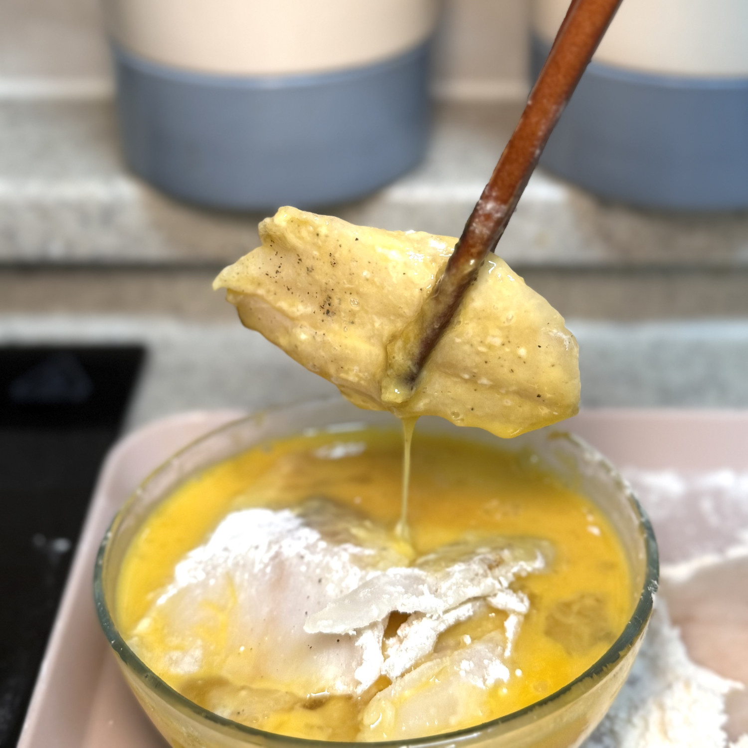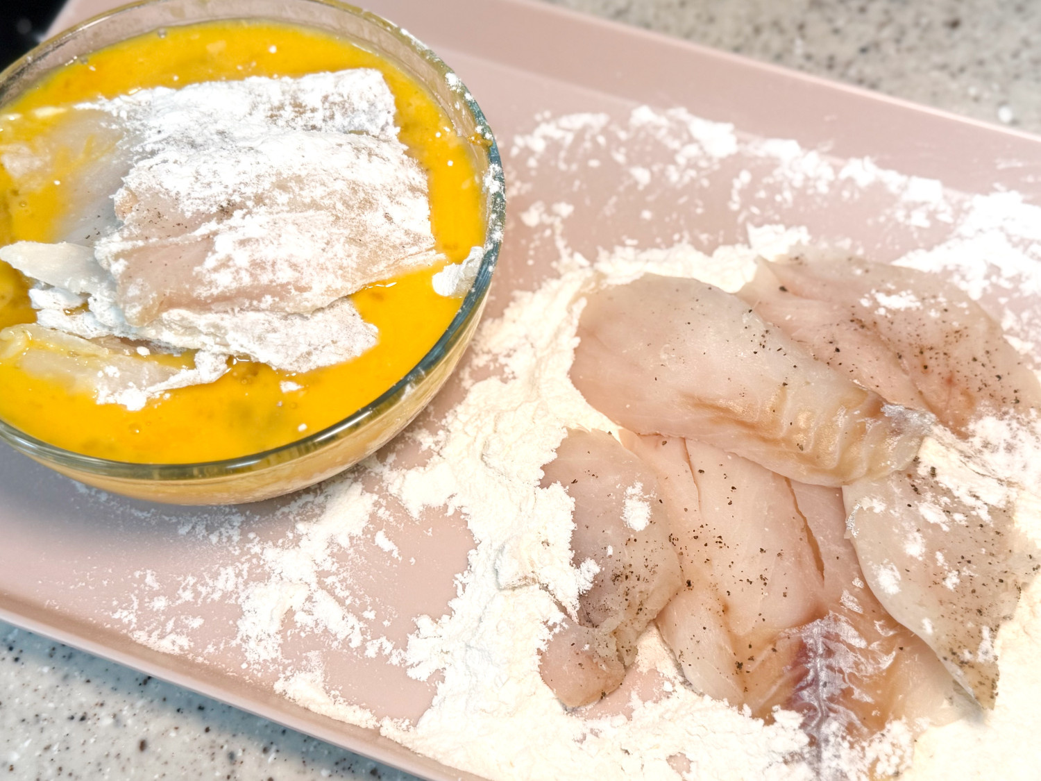 이제부터는 동태살에 부침가루를 살짝 묻힌 뒤 계란물을 묻혀줄게요.