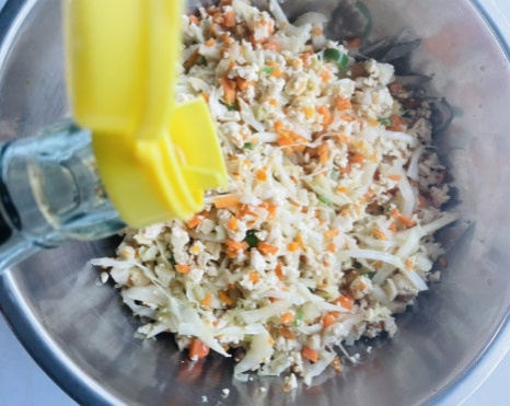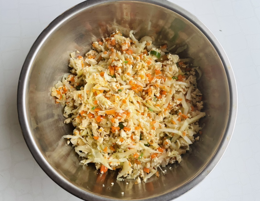 두부와 볶은 양배추와 야채를 한김 식힌 뒤에 볼에 담아 주세요.