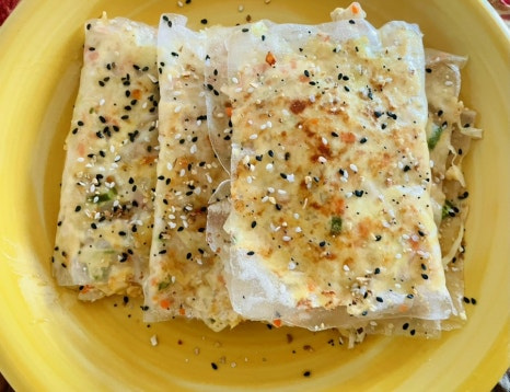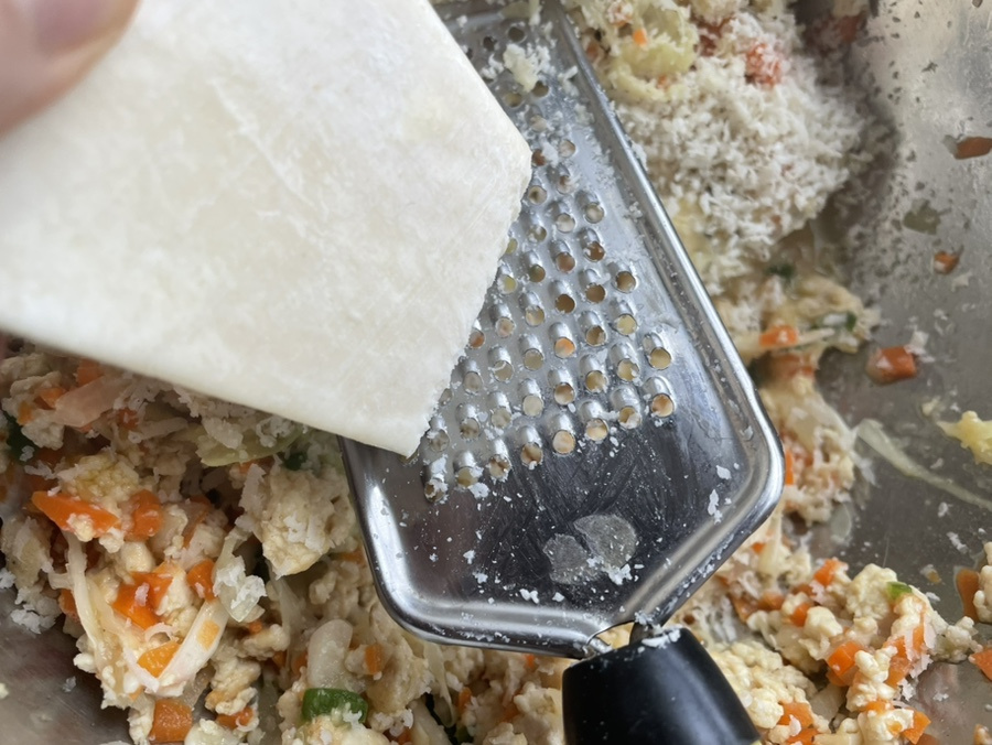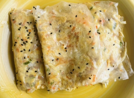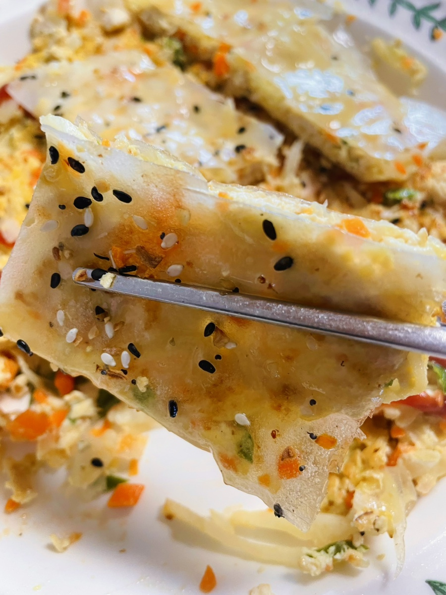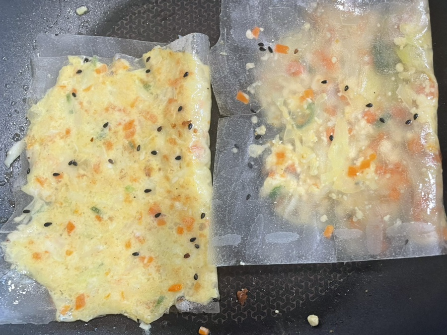 두부 1모 , 라이스페이퍼 4장 , 양배추 2-3장 , 당근 4cm 한토막 , 작은 양파 1개 , 청양고추 2개 , 모짜렐라 치즈나 그라나다치즈 2큰술 정도 , 계란 2개 , 오일 2-3스푼 , 소금 3-4꼬집 , 참기름 1스푼 , 굴소스 1스푼 , 케첩이나 스리랏차 소스 약간