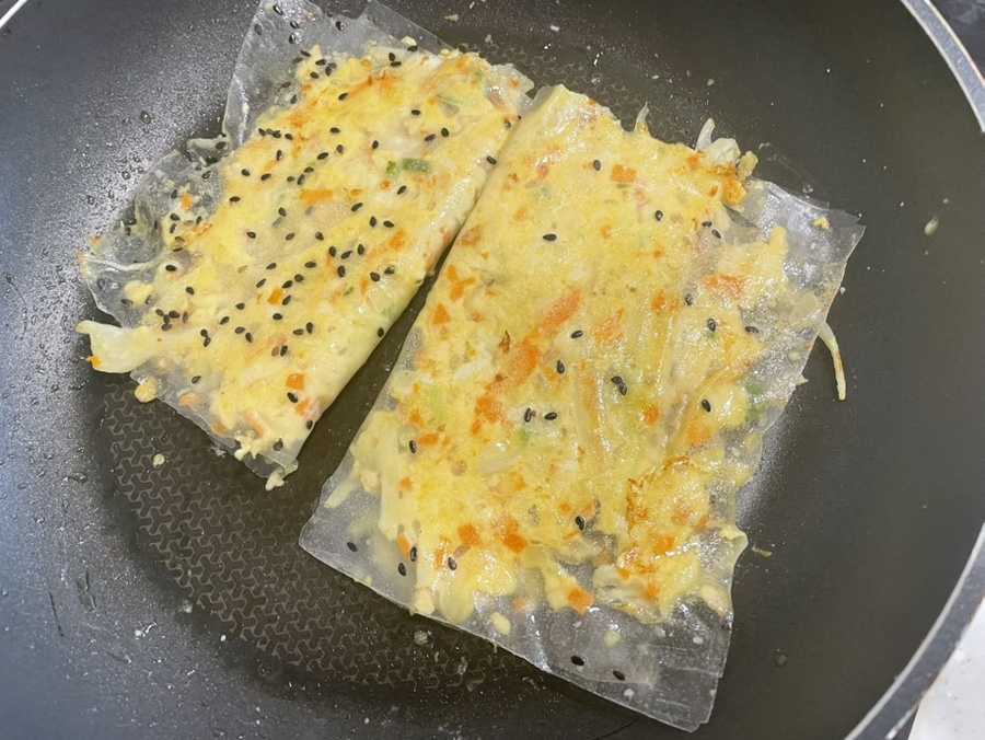 오일 두른 팬에 중강불에서 마른 라이스페이퍼 한장을 깔고 속재료를 반쪽만 펼쳐 주세요.