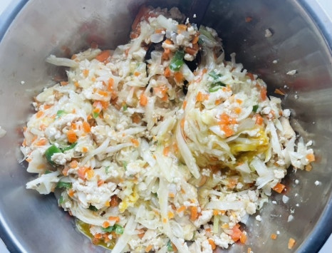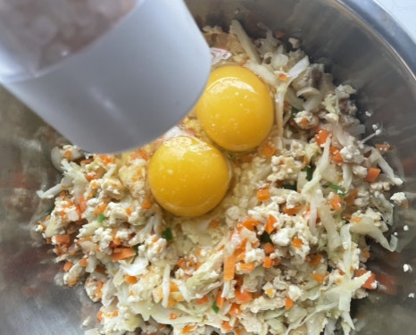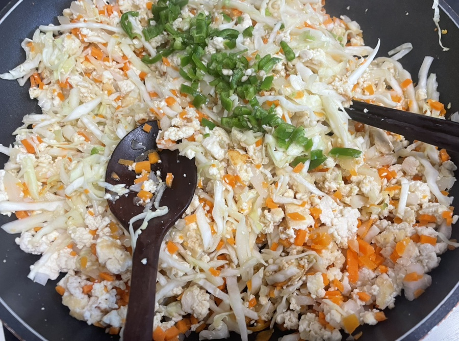 두부에 다진 당근과 양파 넣고 소금 한꼬집 넣고 절여 놓은 양배추를 두손으로 쥐어 짜물기를 빼주고 후라이팬에 같이 볶아 주세요.