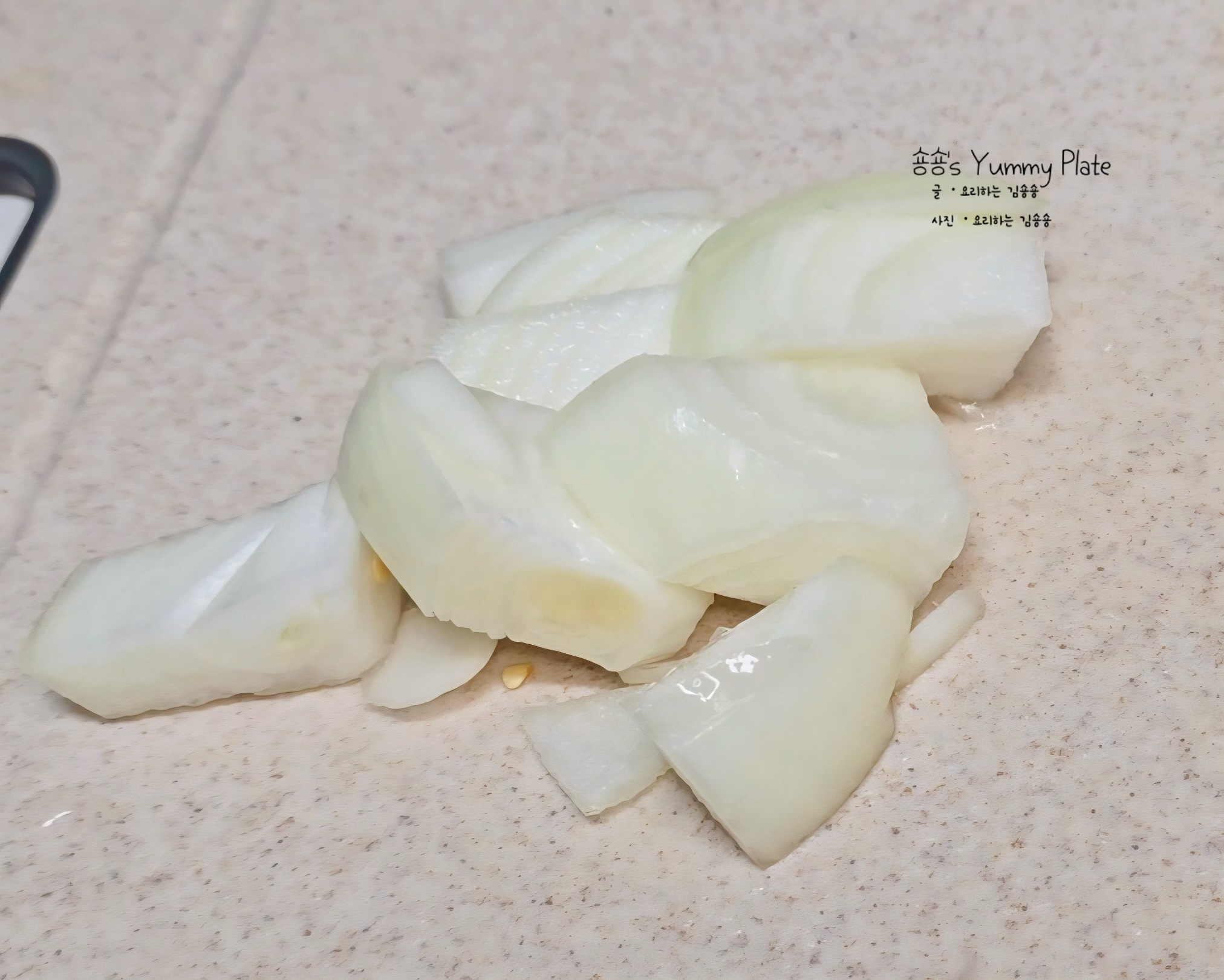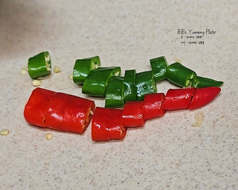 양파는 깍뚝썰기로 준비해주시고 청고추와 홍고추는 송송 썰어주세요.