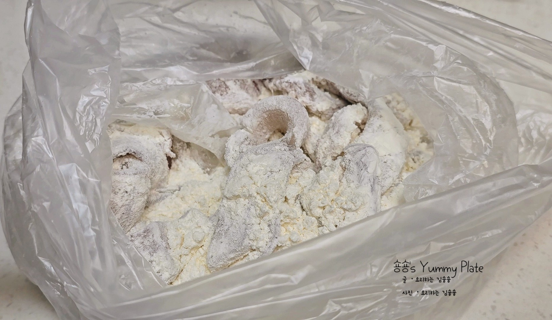 비닐봉지를 살살 흔들어주면 오징어에 덧가루가 고루 묻어 손에 묻지 않고 깔끔하게 덧가루를 묻힐 수 있답니다.