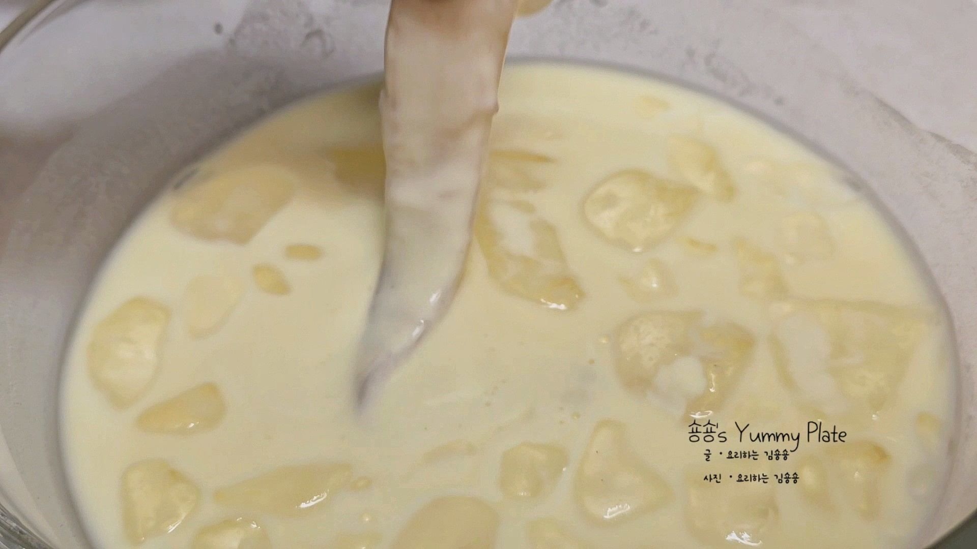 만들어둔 반죽에 덧가루를 묻힌 오징어를 넣고 골고루 반죽을 입혀주세요.