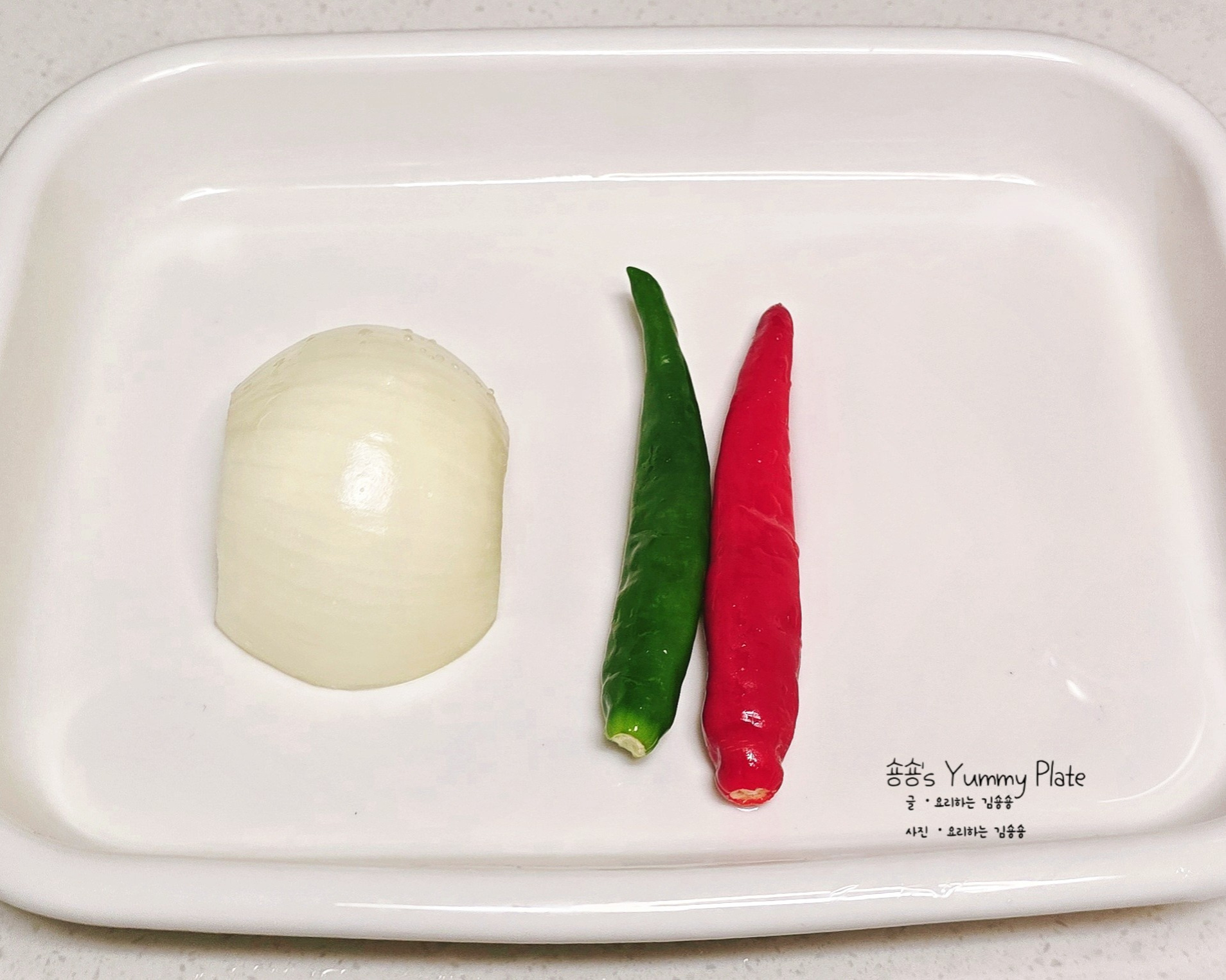 양파 1/2 개 , 홍고추 1 개 , 청고추 1 개
